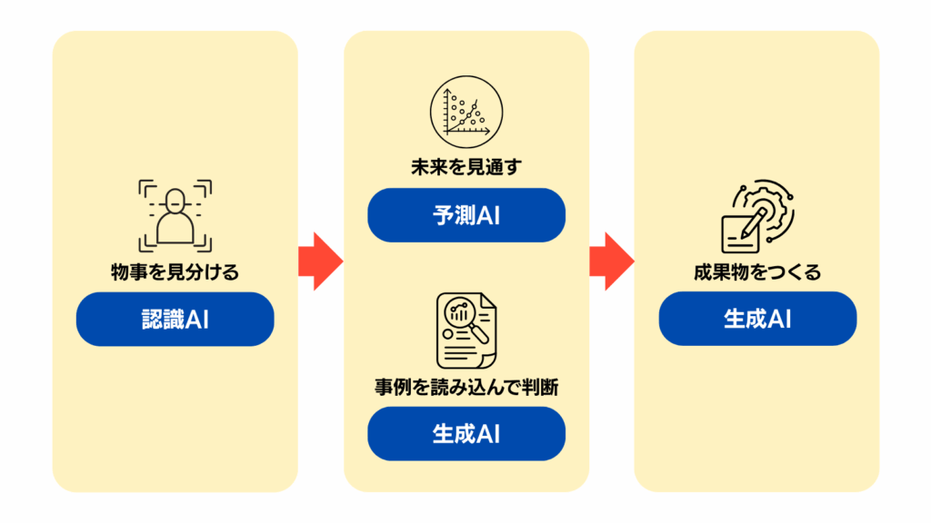 例えば「人が見ないと分からない」、「人が判断する必要がある」、「人でないと作れない」と思われている業務では、従来型のITができることは限定的でした。しかし、AIならばもっとできることがあるかもしれません。人の代わりにAIが画像や文章を認識し、過去のデータに基づく判断をAIの予測が代替し(生成AIが過去事例を読み込んで判断することもあります)、レポートはAIが生成する・・・と考えていけばAI適用箇所が明確になっていきます。