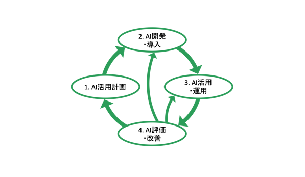 ガイドでは、AI活用を以下の4つのプロセスからなるサイクル型で進めることを推奨しています。このサイクルを継続的に回すことで、AI活用が組織に定着していきます。